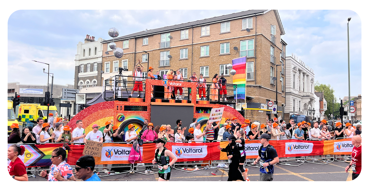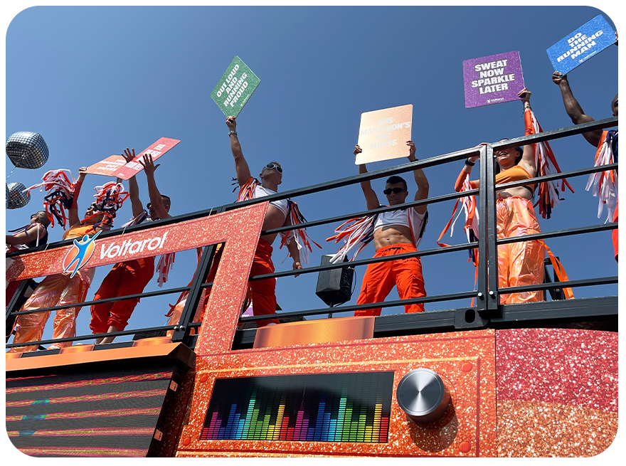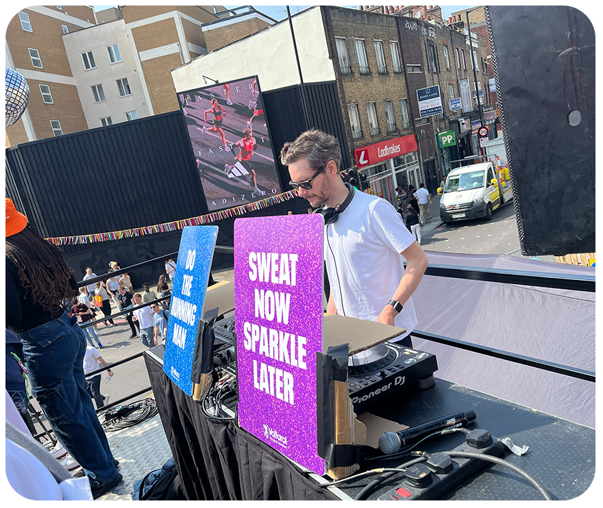 At Mile 21, the glittery Voltarol Boombox created a high-energy moment that boosted morale and generated widespread social media sharing. This activation transformed a physical touchpoint into a digital ripple effect, extending the brand's reach far beyond the racecourse.